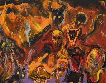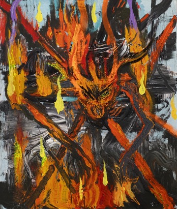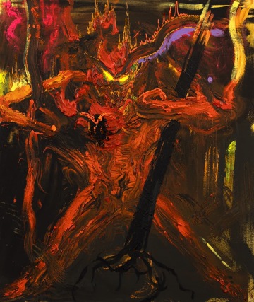 "Vidět hořet les tak blízko že cítíš žár a dým a slyšíš zvuky praskajících větví a těžký dunivý zvuk padlého stromu. Děsí to a fascinuje ta síla… Energie požáru stoupá k nebi, žár, plameny a různé barvy kreseb dýmu. Vize zániku, duše spálených tvorů, levitují. Popel zemi a dým nebi a komu já? O tomto obraz je. O tom mluví řečí malby."